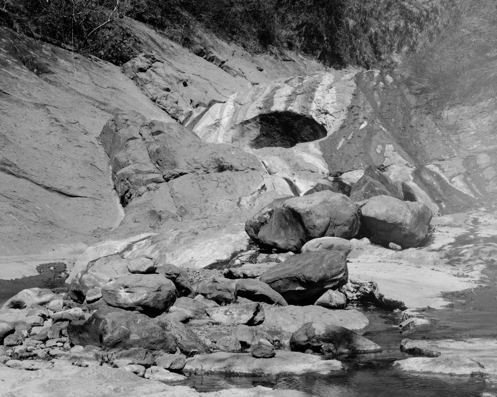 During the period of Japanese occupation in Taiwan, a prolific anti-Japanese rebel named Fang Dazhuang kept a base with other rebels in the mountains of rural Tainan near the Guitan river. One of the bloodiest battles between him and the Japanese left hundreds, or thousands (accounts differ), dead in a location along the river known as Coffin Cave. Eventually, Fang Dazhuang was caught and killed by the Japanese. His grave became Tiegu Mountain Temple, and though remote and not well known, it is quite efficacious, and a massive golden snake has been seen behind the temple by a few worshippers. The temple is not far from Coffin Cave, but Coffin Cave is difficult to find and known only by a few locals. To get there from the temple, one must drive 20 minutes along a treacherous mountain backroad, then hike and river trace for 15 minutes. Coffin Cave is in fact a pair of water pits.